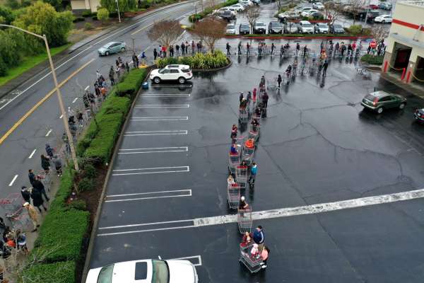 People wait in their cars Thursday, April 9, 2020, at Traders Village for the San Antonio Food Bank to begin food distribution. The need for emergency food aid has exploded in recent weeks due to the COVID-19 coronavirus epidemic. The Labor Department said Thursday 6.6 million people applied for first time unemployment benefits.