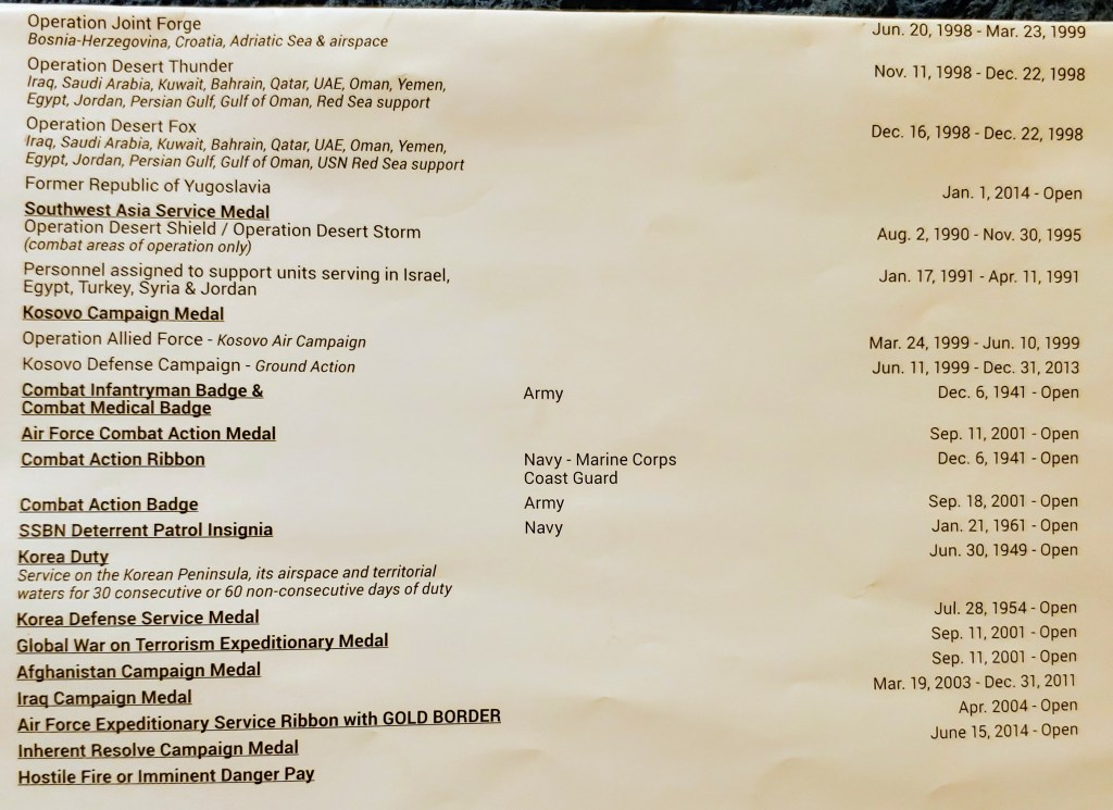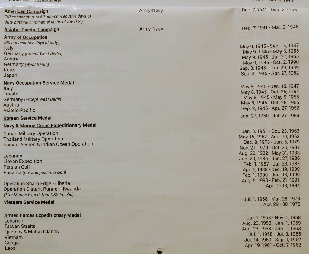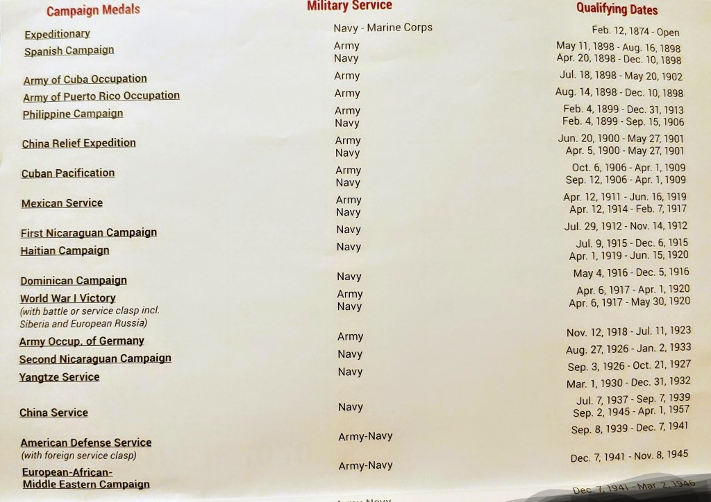 Campaign Medals/Military Service/Qualifying Dates November 22, 2020 Share this: Share on X (Opens in new window) X Share on Facebook (Opens in new window) Facebook Like Loading... Related