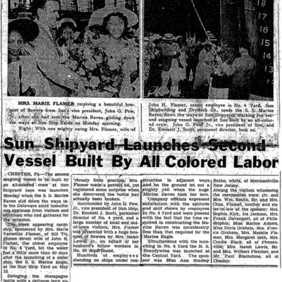 This newspaper article discusses the launch of the S.S. Marine Raven, the second vessel built by an all African American crew, at Sun Shipyard in Chester, Pennsylvania. This ship was built 30 days after the launch of the S.S. Marine Eagle, the first seagoing vessel built by an all African-American crew.
