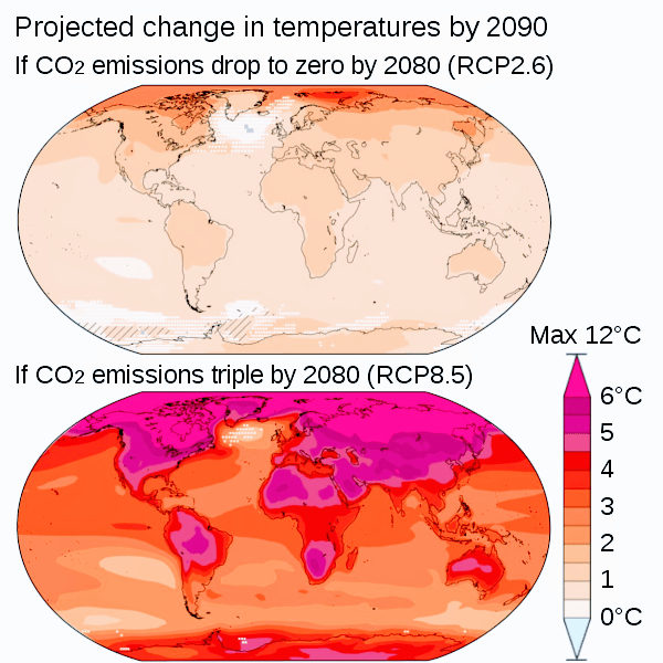Further information: Carbon budget, Climate model, and Carbon cycleAverage climate model projections for 2081–2100 relative to 1986–2005, under low and high emission scenarios