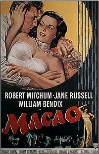 Robert Mitchum, RKO’s most prolific lead of the late 1940s and early 1950s,[99] costarred in Macao (1952) with Jane Russell, who was personally contracted to Howard Hughes.[151] Director Josef von Sternberg‘s work was combined with scenes shot by Nicholas Ray and Mel Ferrer.[152]