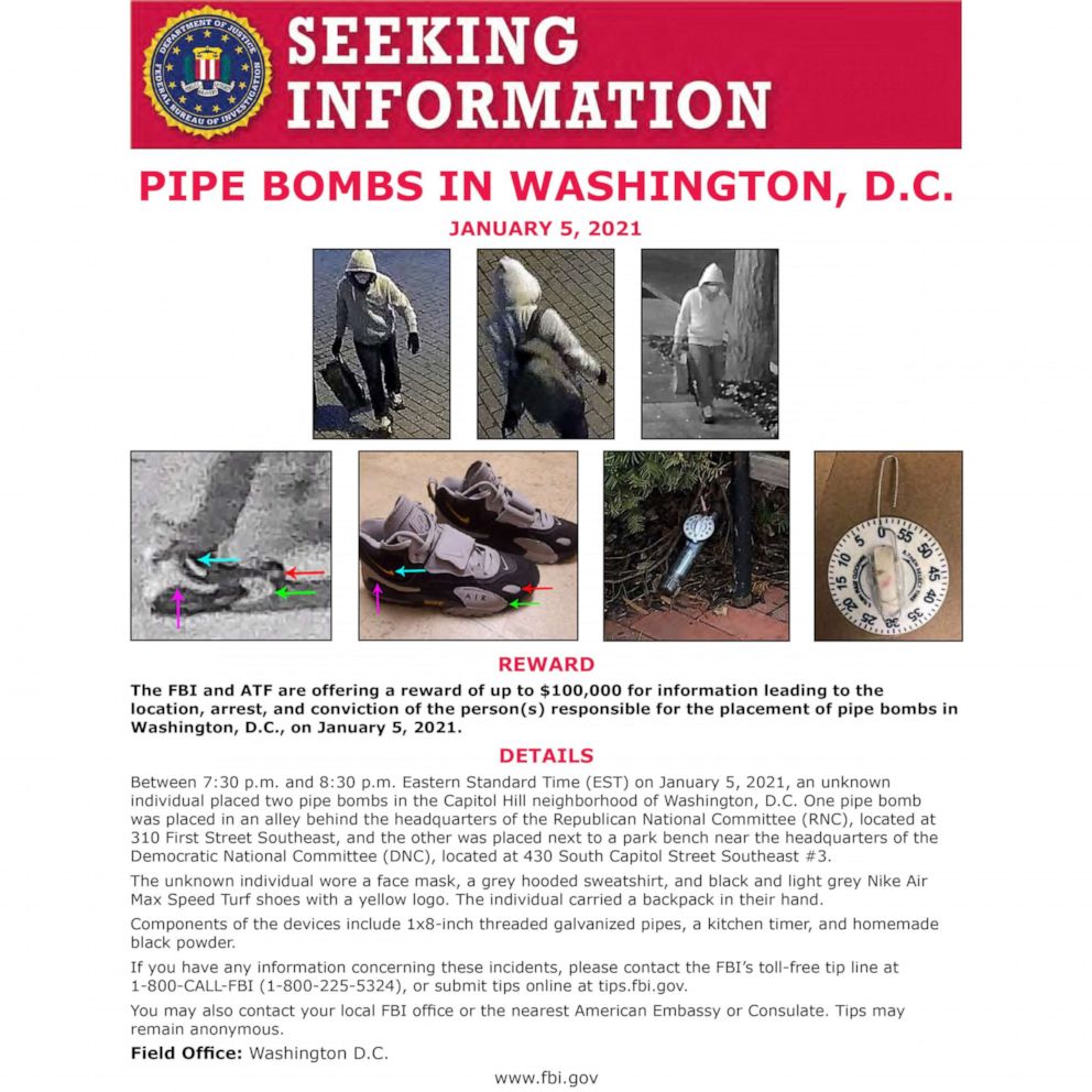 A reward of up to $100,000 is available for information leading to the location, arrest, and conviction of the person(s) responsible for the placement of pipe bombs in Washington, D.C., on January 5, 2021. View videos, photos, and additional information.