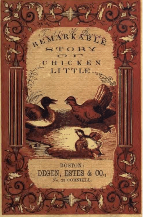 “Remarkable Story of Chicken Little” (1840) is a folk tale about a chicken who believes the world is coming to an end. The phrase “The sky is falling!” features prominently in the story, and has passed into the English language as a common idiom indicating a hysterical or mistaken belief that disaster is imminent.
