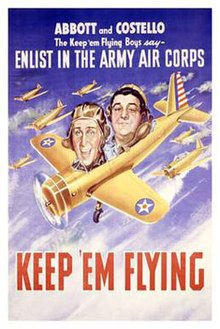 Keep ‘Em Flying was filmed at the Cal-Aero school in Ontario, California from September 5-October 29, 1941 under the working title Up in the Air. Costello’s brother Pat Costello was used as Lou’s stunt double.[6] Cinematographer Elmer Dyer filmed the aerial sequences with Paul Mantz looking after the aerial “stunts”.[7]