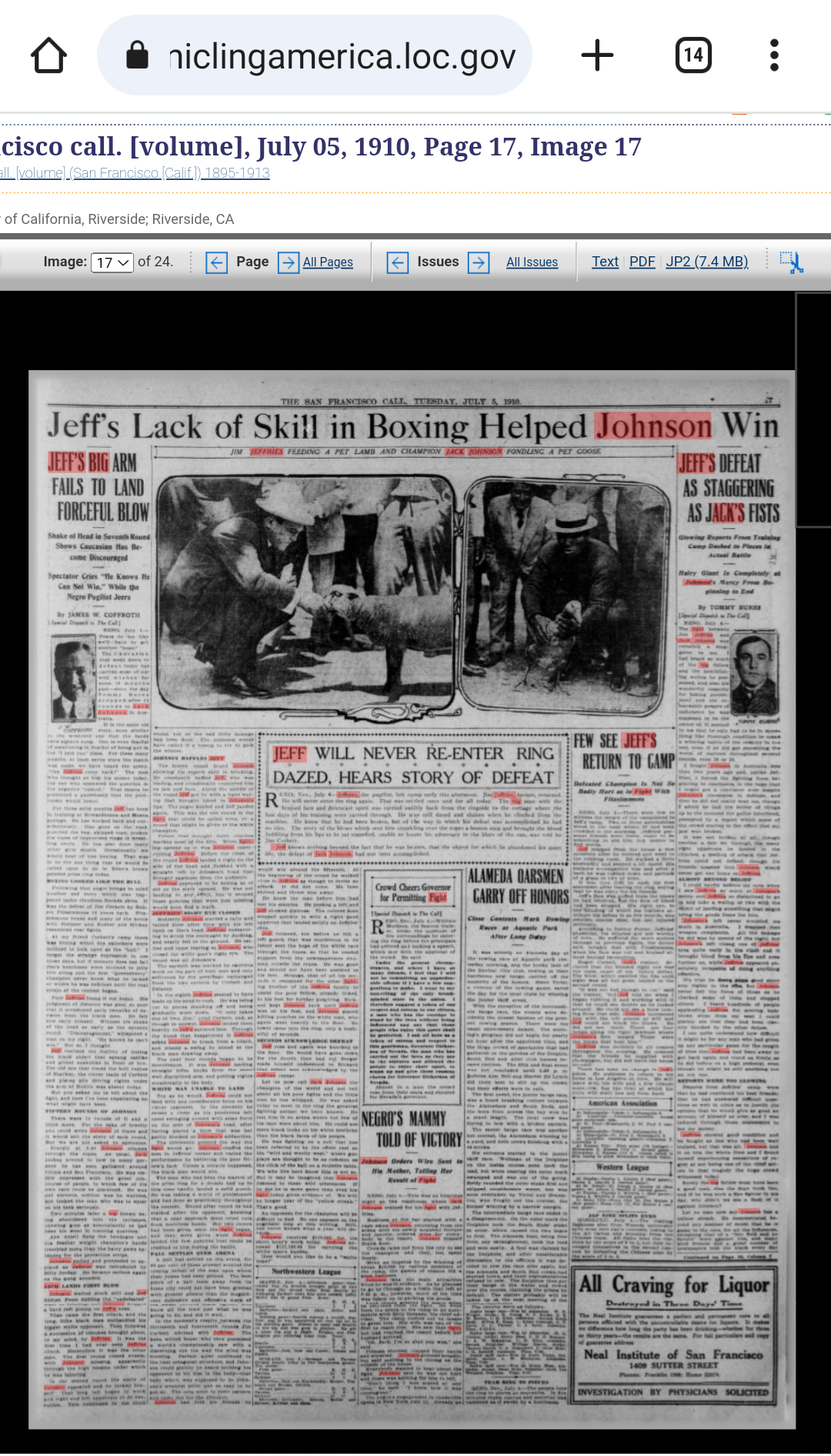 Blacks, on the other hand, were jubilant, and celebrated Johnson’s great victory as a victory for racial advancement. Black poet William Waring Cuney later highlighted the black reaction to the fight in his poem “My Lord, What a Morning”.[20]
