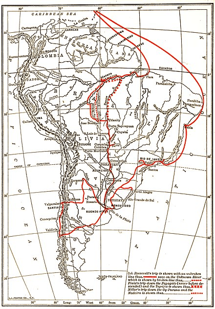 The Roosevelt–Rondon Scientific Expedition (Portuguese: Expedição Científica Rondon–Roosevelt) was a survey expedition in 1913–14 to follow the path of the Rio da Dúvida (“River of Doubt”) in the Amazon basin. The expedition was jointly led by Theodore Roosevelt, the former President of the United States, and Colonel Cândido Rondon, the Brazilian explorer who had discovered its headwaters in 1909. Sponsored in part by the American Museum of Natural History, they also collected many new animal and insect specimens. The river was eventually named “Rio Roosevelt” for the former president. He nearly died during the voyage and his health was permanently damaged.[1]