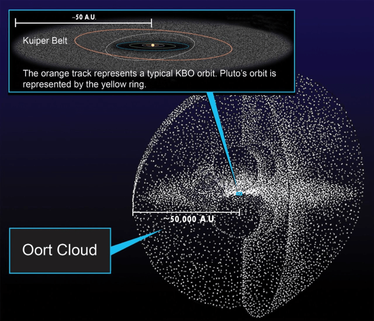 For decades, scientists have theorized that beyond the edge of the solar system, at a distance of up to 50,000 AU (0.79 ly) from the sun, there lies a massive cloud of icy planetesimals known as the Oort Cloud.