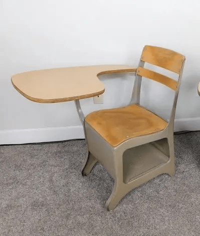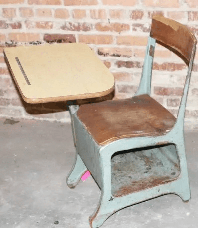 You sat on the seat and wrote on the Desktop of the Desk in front of you. And you used a No.2 Pencil. These desks were facing the same way towards the teacher.