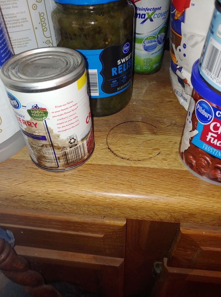 But when I went to put one can in the refrigerator, the can was sticky, yucky feeling to my fingers, and both cans were sticky and they had this sticky discoloring on the sides of the cans. And under one, there was a ring under it with who knows what? And that can was STUCK to the countertop.