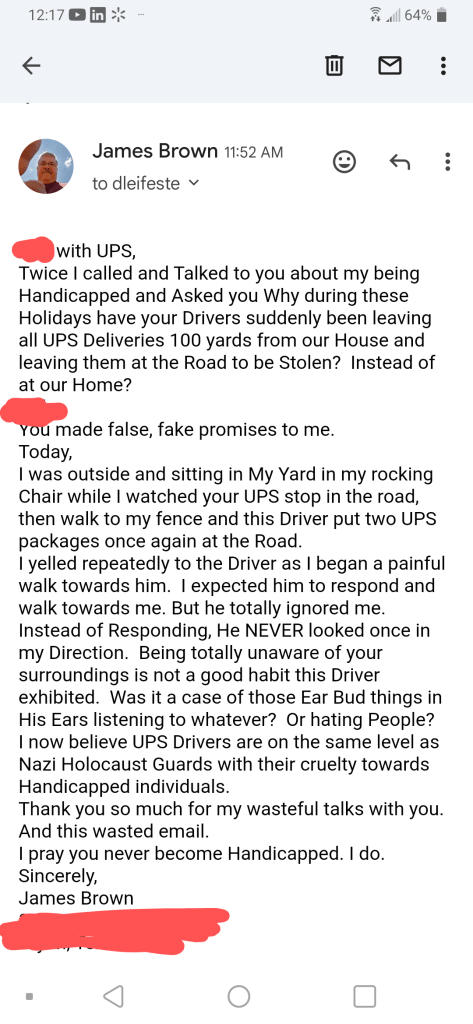 Most handicap individuals hate discussing it or sharing their being Handicapped. But I got to share this with you. And I hope this doesn’t happen to you. I am HANDICAPPED. And UPS knows it too!