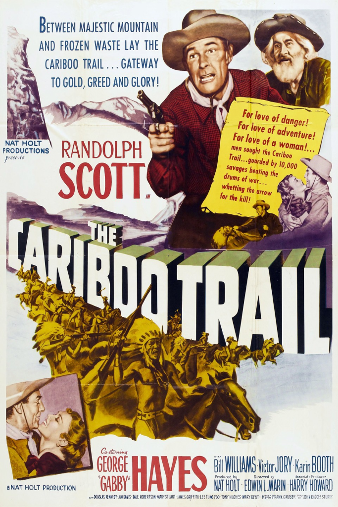 The Cariboo Trail is a 1950 American Western film directed by Edwin L. Marin and starring Randolph Scott.[1] Though most men are concerned with prospecting gold, American ranchers Jim Redfern (Randolph Scott) and Mike Evans (Bill Williams) are trying to make a fortune by leading a long line of cattle from Montana to Canada. While they are resting one night, their herd is robbed by a gang of thugs, leaving the cowboys stranded in the wilderness without their livelihood. Jim and Mike then decide to try their hands at mining gold, but before long they run into the enemy bandits again.
