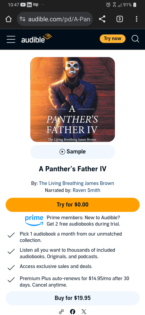 “The thrilling adventure continues! The audiobook version of ‘A PANTHER’S FATHER IV’ is now live, narrated by the phenomenal narrator-RAVEN SMITH. Whether you’re an audiobook enthusiast or looking for a new way to experience the story, immerse yourself in this captivating tale on the go!”