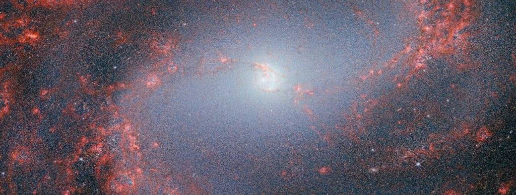 This image of the spiral galaxy IC 5332, taken by the NASA/ESA/CSA James Webb Space Telescope with its MIRI instrument, has been scaled and cropped to match the NASA/ESA Hubble Space Telescope???s view of the same galaxy.