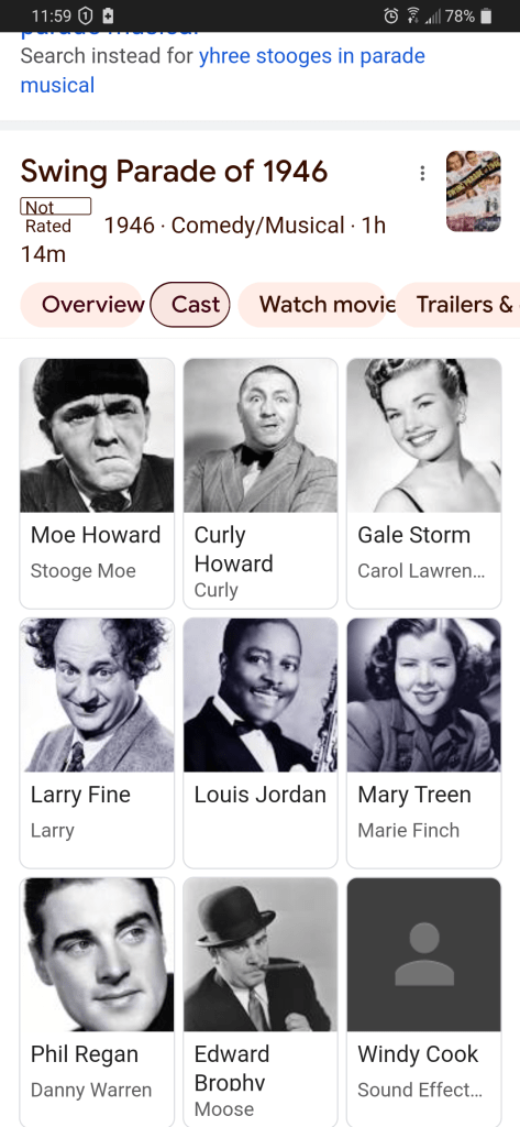 Swing Parade of 1946 is a 1946 musical comedy film directed by Phil Karlson and released by Monogram Pictures. The film features Gale Storm, Phil Regan, and The Three Stooges (Moe Howard, Larry Fine and Curly Howard), Edward Brophy and musical numbers by Connee Boswell and the Louis Jordan and Will Osborne orchestras, including “Stormy Weather” and “Caldonia“.
