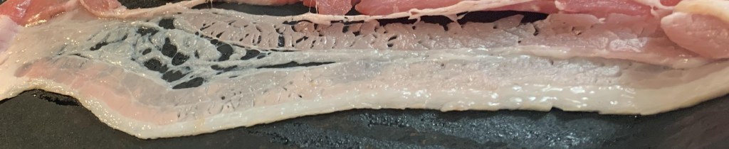Paper Thin Sliced Complaining Paper Thin Bacon is TOO MUCH. Yesterday, I opened a new pack of Sliced Bacon to cook for breakfast. But as I pulled each slice of Bacon off the rest of the Bacon Slices, I WAS SHOCKED! I could almost completely see thru each slice. Each Slice waa a Shocker! Why? So darn thin it stunk!!!
