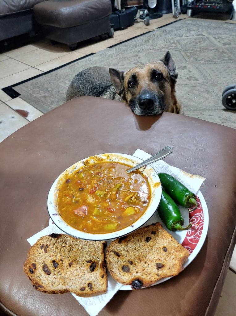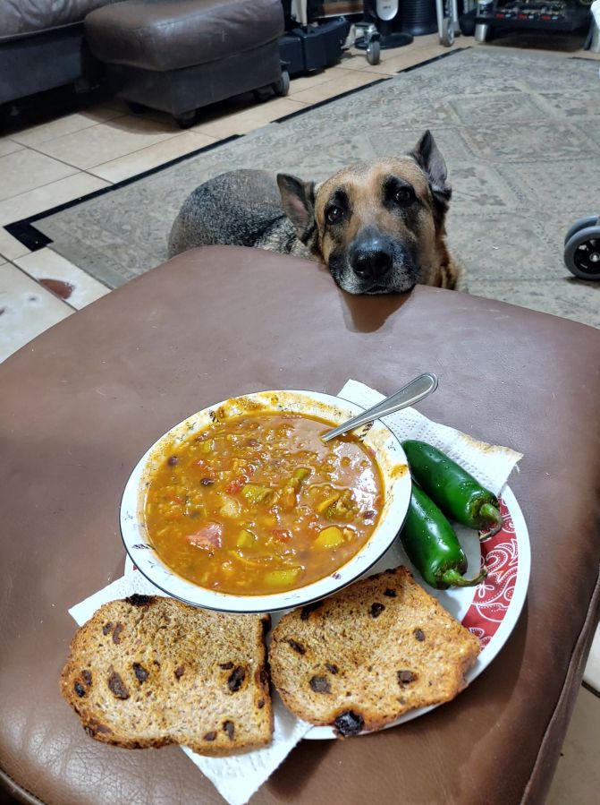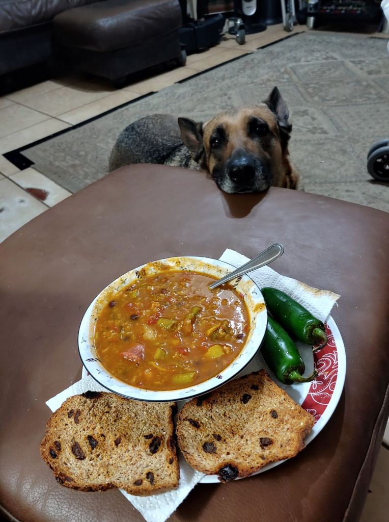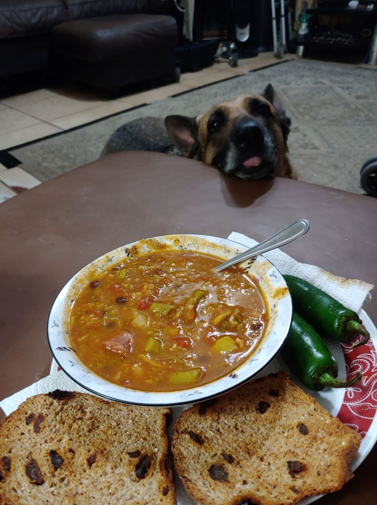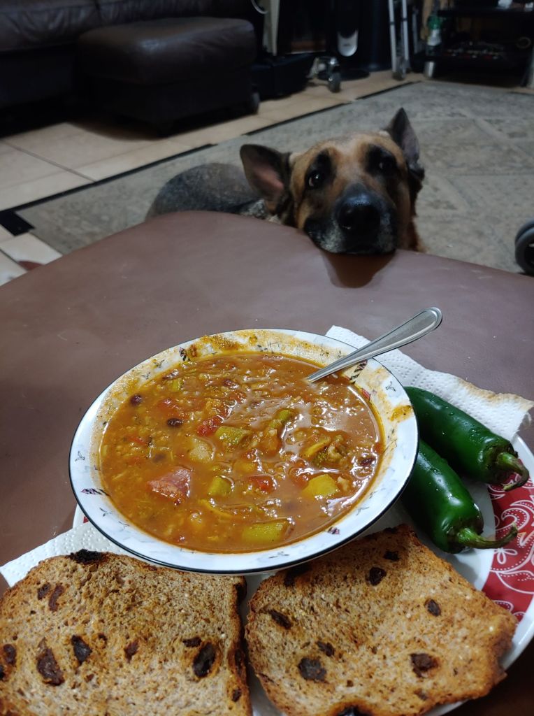 If you think this looks good. Then comment and I might add the recipe. It’s Texas Style with a Texas Mixture and a Texican Twist. Look at that. Vegetable Soup, Raisin Bread Toast and two Jalapenos. And a German Shepherd licking her lips. Lol