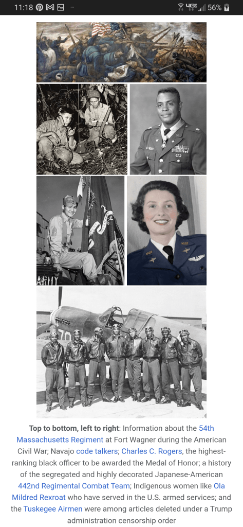 In compliance with an executive order by President Donald Trump, the United States Department of Defense made a series of controversial deletions of content acknowledging achievements made by historically underrepresented groups. The department released a statement in January 2025 that celebration of “identity months” was prohibited as it was believed to “erode camaraderie and threaten mission execution… Installations, units, and offices are encouraged to celebrate the valor and success of military heroes of all races, genders, and backgrounds as we restore our warrior culture and ethos… but we will focus on the character of their service instead of their immutable characteristics.”[1] Guidance released in February stated, “By March 5, 2025, all Components must remove and archive DoD news articles, photos, and videos promoting Diversity, Equity, and Inclusion (DEI), including content related to critical race theory, gender ideology, and identity-based programs.”[2] American historian Heather Cox Richardson has argued that “The erasure of Indigenous, Black, Hispanic, and female veterans from our military history is an attempt to elevate white men as the sole actors in our history.”[3]