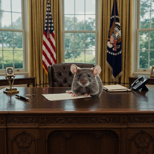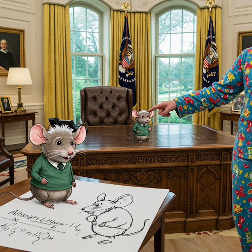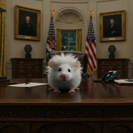 In the Oval Office, under the ornate desk, the peculiar debate unfolded late at night. The mouse, sporting the head of Albert Einstein, adjusted his tiny glasses and cleared his throat, evidently ready for a serious discussion.