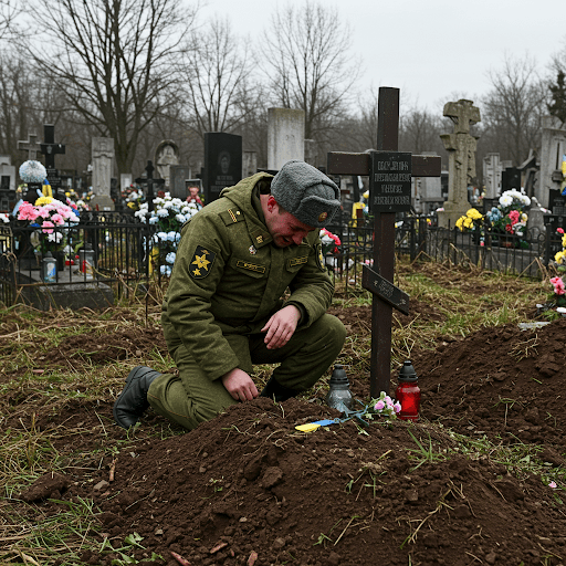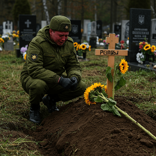 Russian Soldier visiting Ukrainian Grave in Ukraine Cemetery.