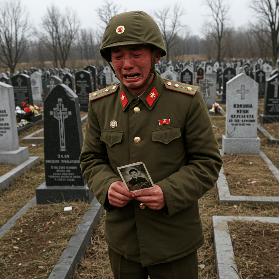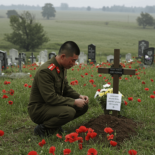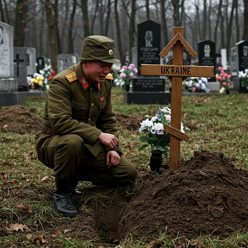North Korean Soldier at Ukrainian Grave in Ukraine Cemetery