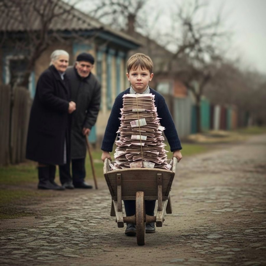 Russian boy carrying Russian Rubles in an old wooden wheelbarrow. The payment for the Death of his older brother killed in Ukraine. Another Conscription for the Russian War of Atrocity.