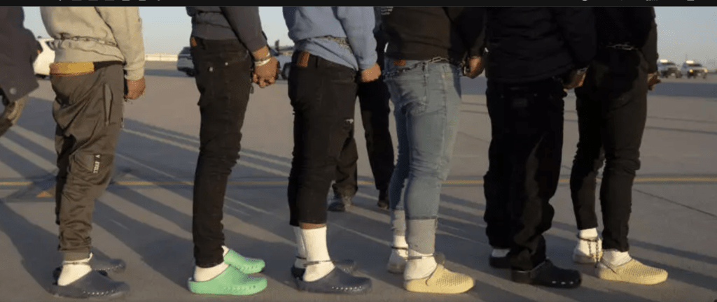 It’s not Complex! It’s sticking people in inhumane facilities treating them like Livestock. Hurry! Get Them Gone! Below are the now Deportered lining up for their Flight in belly chain and Handcuffs and Fresh Pair of Guaranteed Worker Shoes paid for by YOU, the Taxpayer. What a Crock?