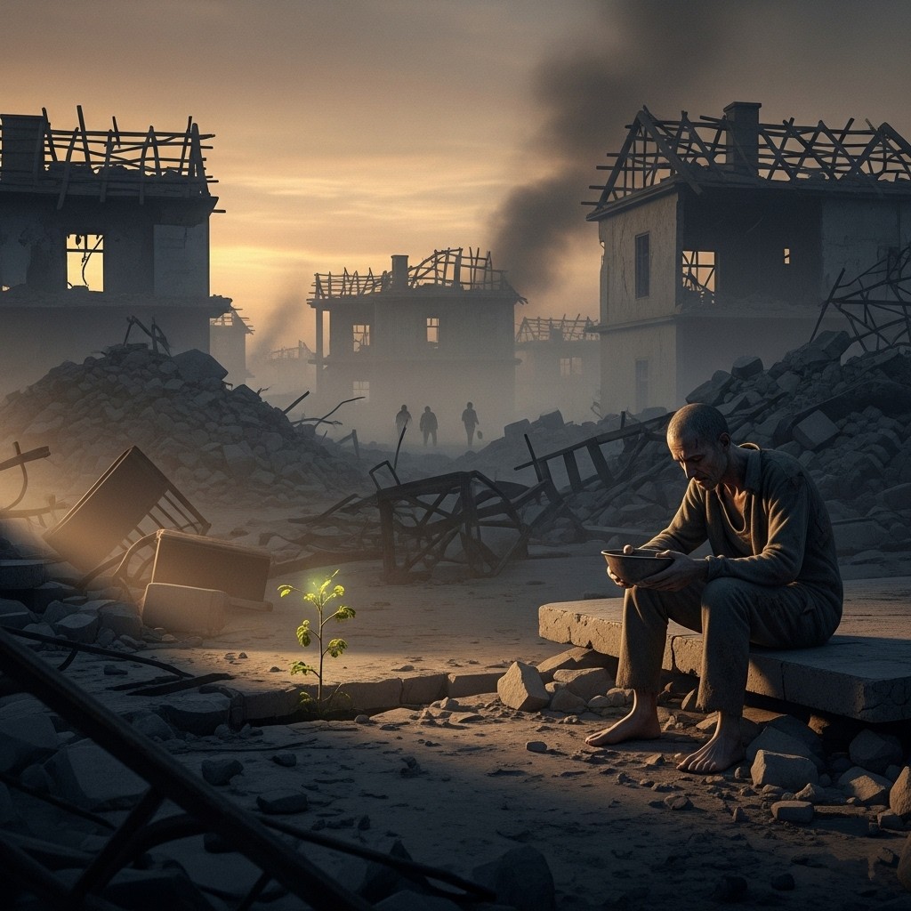 From shattered homes where dust alone now thrives,