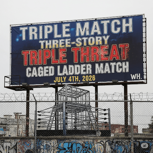 On July 4th, 2026, the UFC will have incredible UFC Matches in the Ballroom of the WhiteHouse(in case of bad weather). Or on the Lawn of the WH if the weather is good. Russian, American, and Chinese Fighters will be there. But the lawn is a possibility too. But the Main Event is a WWE Triple Match Three-Story Triple Threat Caged Ladder Match starring President Donald Trump, Senator Nancy Pelosi, and Senator Mitch McConnell. John Cena will be the Referee.
