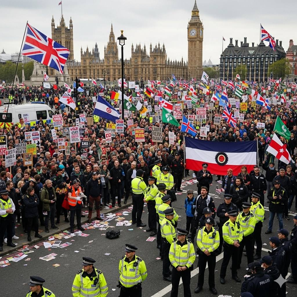 - “Unite the Kingdom” Rally: A large-scale protest, estimated by police to have drawn between 110,000 and 150,000 people, was led by far-right activist Tommy Robinson.2 This rally was billed as a demonstration for “free speech” but focused heavily on anti-immigration and national identity themes.3