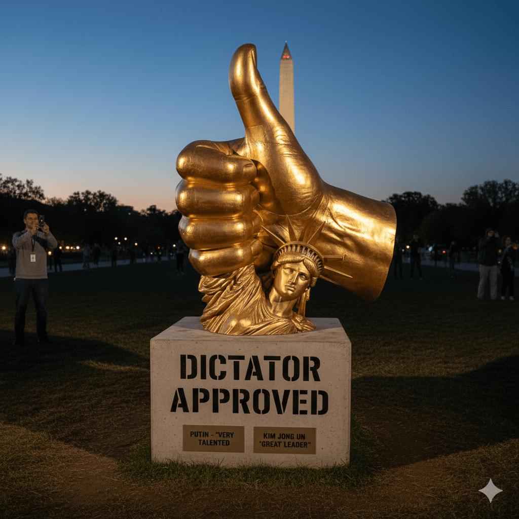- The “Dictator Approved” Statue: Another recent temporary artwork, also gold-colored, depicted a golden thumbs-up crushing the crown of the Statue of Liberty.4