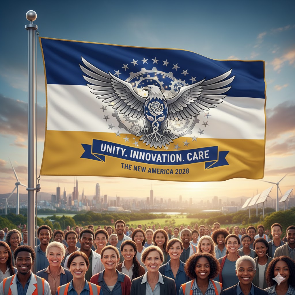 The flag of the 2028 Unity Movement—with its powerful eagle embracing innovation, surrounded by the stars of unity, and underscored by the unwavering commitment to care—is more than just a symbol. It is a roadmap.