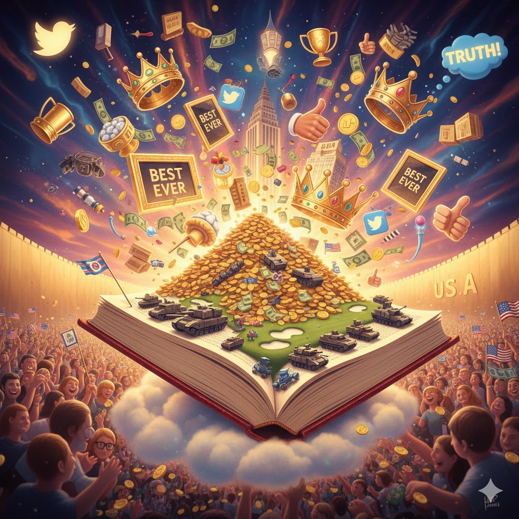 This vast catalog of desires, which serves as the “external scaffolding” for an identity seeking constant validation, can be imagined as a set of colossal, impossible decrees—the Trumpian Tablet of Wants—eternally projected onto the national capital. Trump wants $240 Million Dollars from the DOJ. His wants are Endless!