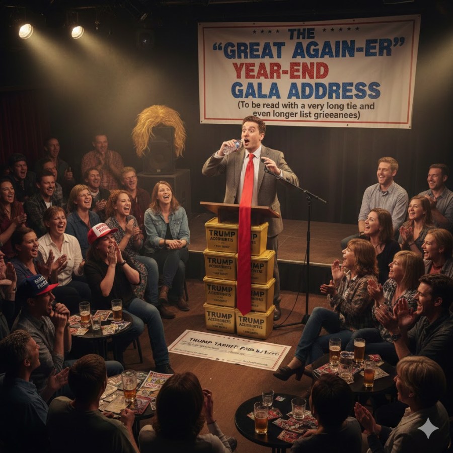 So tonight, pull up a chair, grab a glass of ‘Tariff-Free Tap Water,’ and enjoy the show. Because in 2026, we’re not just making America Great Again—we’re putting a gift shop in the Lincoln Memorial! Goodnight!”