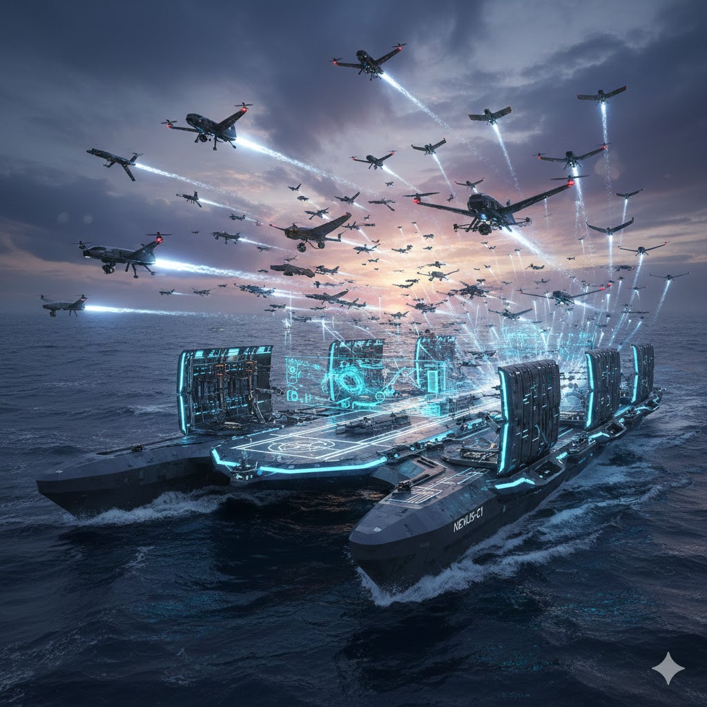 - Hull Design: A “Trimaran” (three-hull) or “SWATH” (Small Waterplane Area Twin Hull) design for extreme stability during mass drone launches in rough seas.