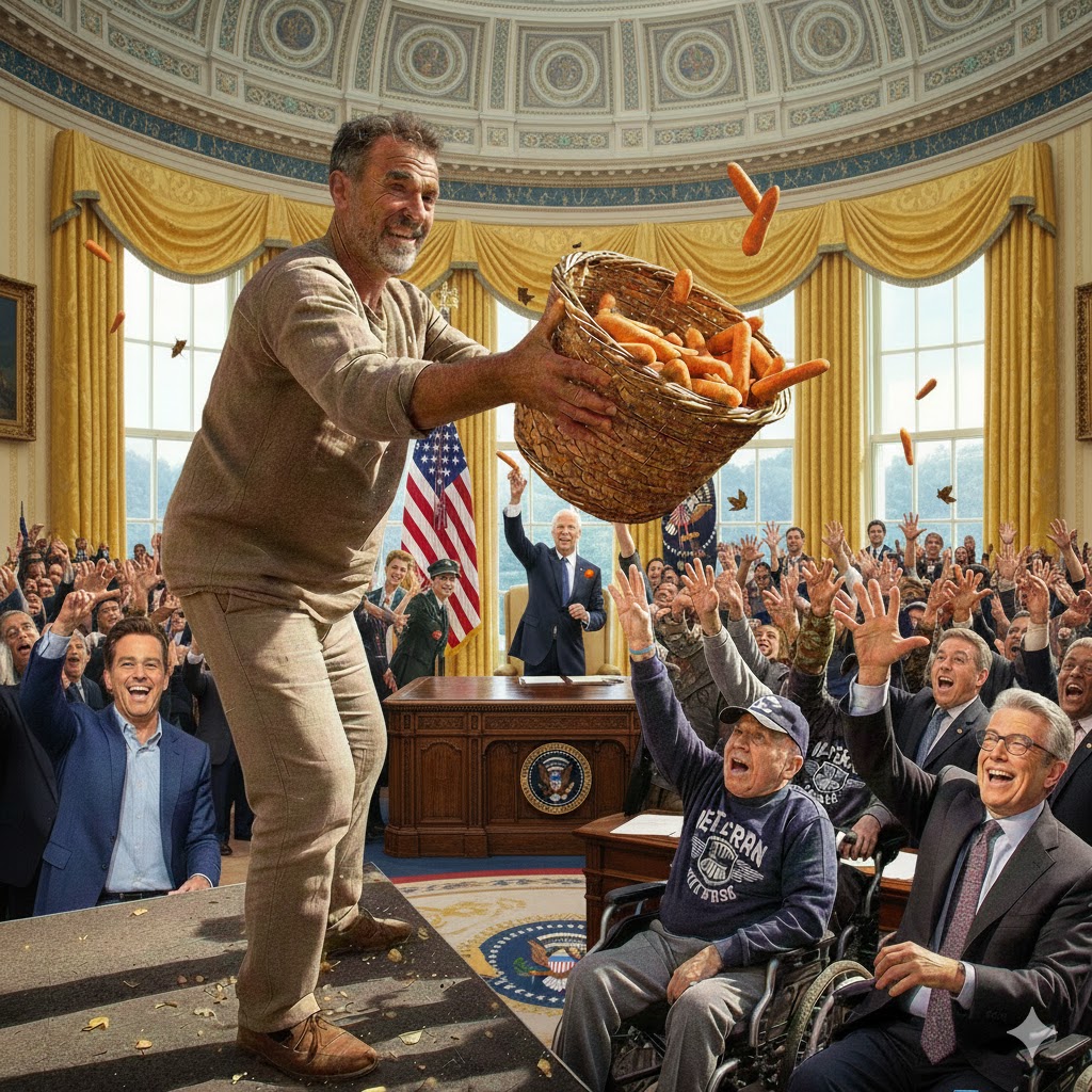 On the other side of town, Barnaby Root deployed a fleet of drones. They hovered over parks and schools, dropping bundles of organic, heirloom carrots tied with silk ribbons.