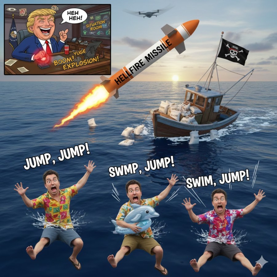 “YO HO HO! HERE COMES A HELLFIRE!” Trump shouted in the Situation Room, finally slamming his hand down. He didn’t just push the button; he gave it a little jazz-hands flourish.