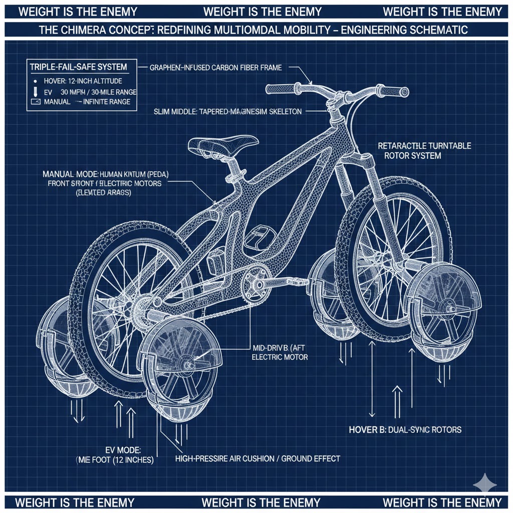 The greatest challenge in personal transport has always been the “weight-utility paradox.” To travel further or higher, we usually add mass, which in turn requires more power. The Chimera breaks this cycle. It is a tri-modal vehicle—Bicycle, EV-Bike, and Hover-Bike—engineered with a singular obsession: Weight is the Enemy.