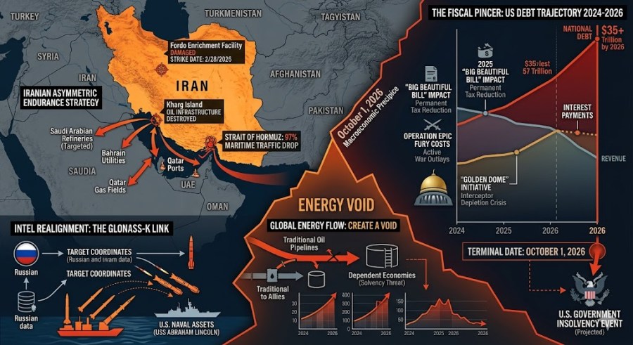 ​Compounding this crisis is the reported realignment of global intelligence networks, where the Russian Federation—leveraging the remnants of its traditional security apparatus—has transitioned from a passive observer to an active provider of targeting information to Iranian forces, specifically to compromise American naval and aerial assets. Simultaneously, the domestic fiscal health of the United States has reached a point of critical vulnerability. The cumulative weight of the 2025 “Big Beautiful Bill,” the multi-billion-dollar “Golden Dome” missile defense initiative, and the expansionist military posture of “Operation Southern Spear” has projected a terminal date for American fiscal stability, colloquially identified in internal and public discourse as October 1, 2026. This report provides an exhaustive scholarly analysis of these converging threats, examining the mechanisms of warfare, the ethics of current command structures, and the structural drivers of the impending 2026 bankruptcy.