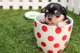 short coated black and brown puppy in white and red polka dot ceramic mug on green field April 17, 2020April 17, 2020