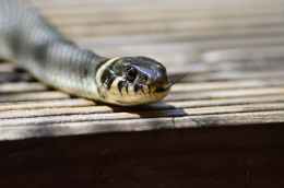 white and gray snake on brown wooden table top
