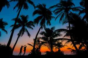 silhouette photography of man and woman beside trees during sunset