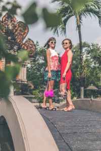 two women wearing sunglasses and holding bags standing on foot bridge