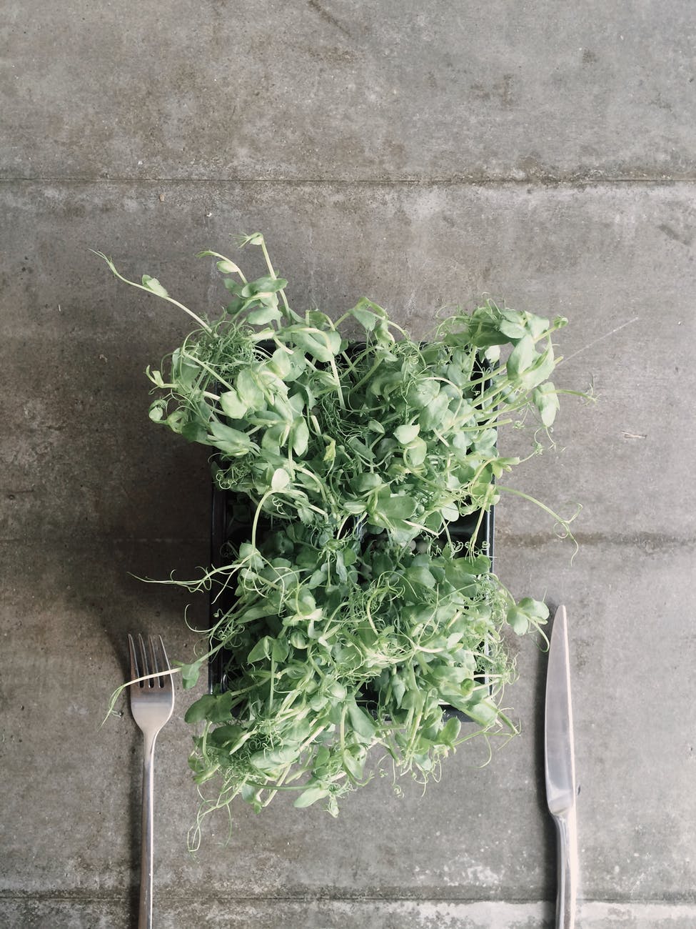 green leaf vegetable on black container near gray fork and knife