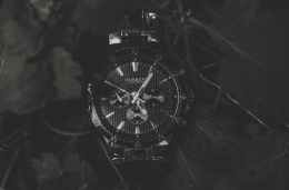 round black current chronograph watch with link bracelet