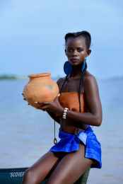 woman sitting on boat holding brown clay pot