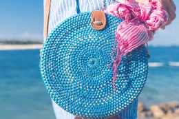 pink scarf and blue bag