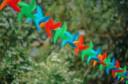 selective focus photography of pinwheels on string