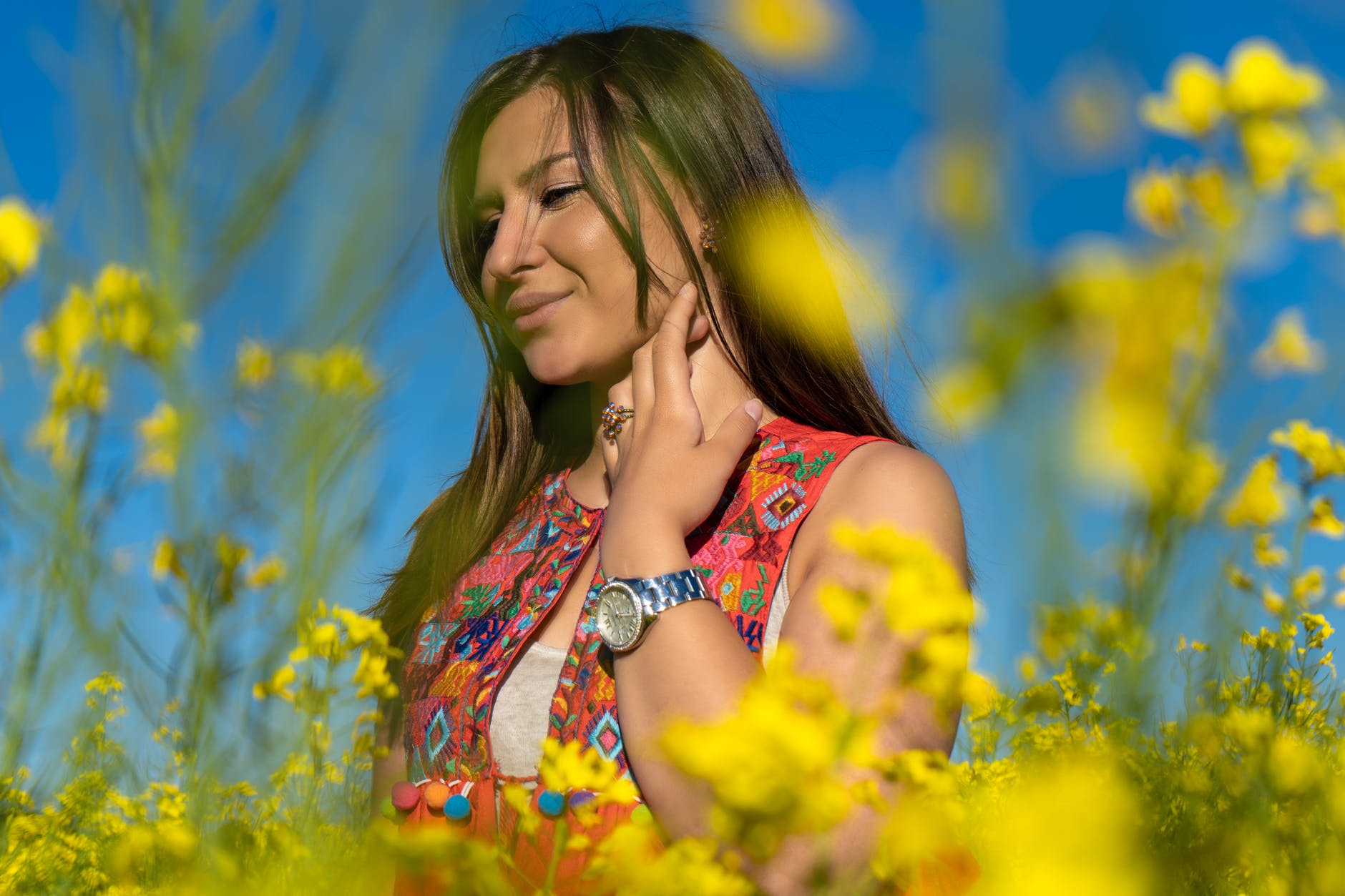 woman wearing gray watch standing on a bed of yellow flowers