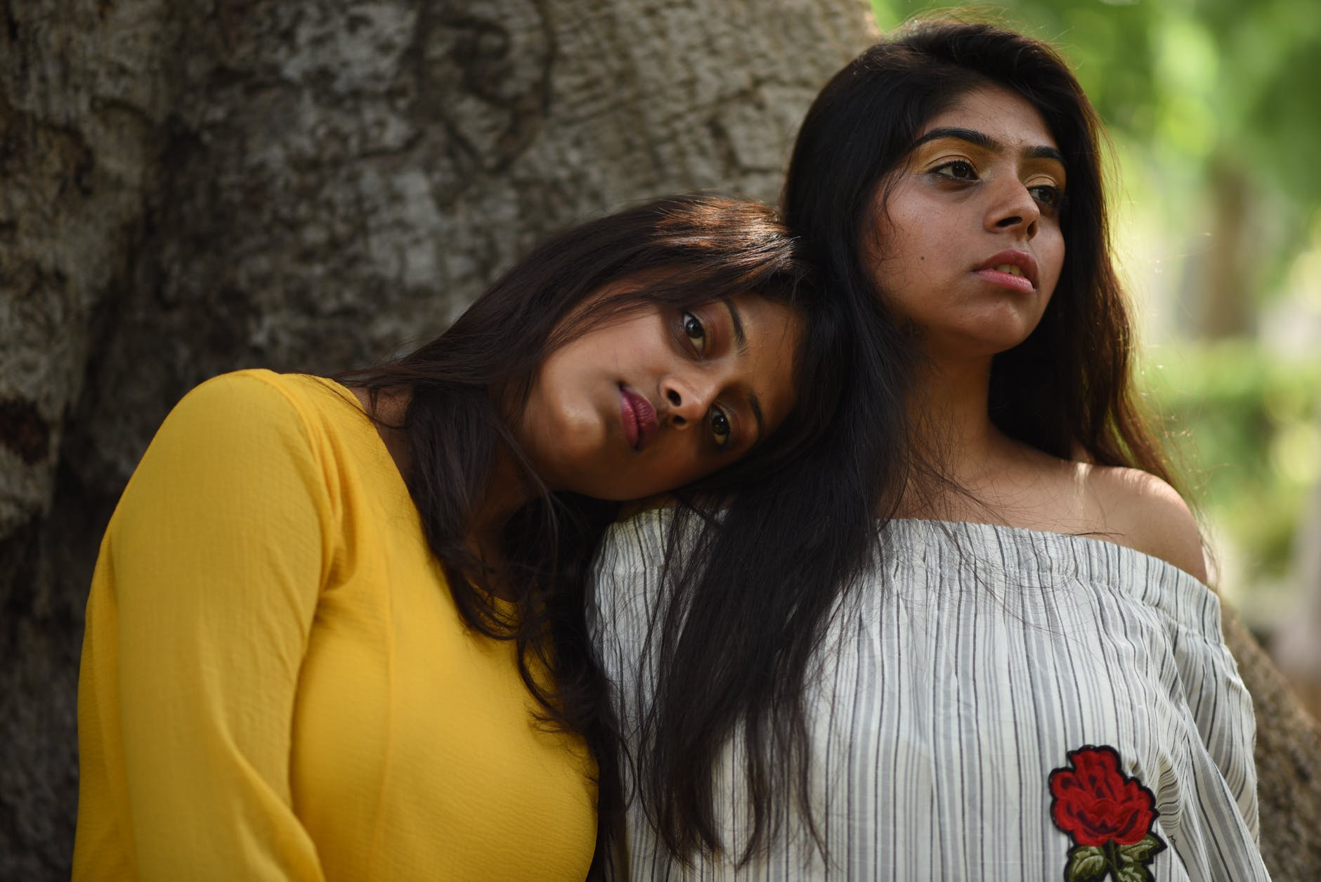 two women resting under tree
