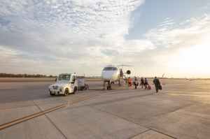 people walking towards white plane